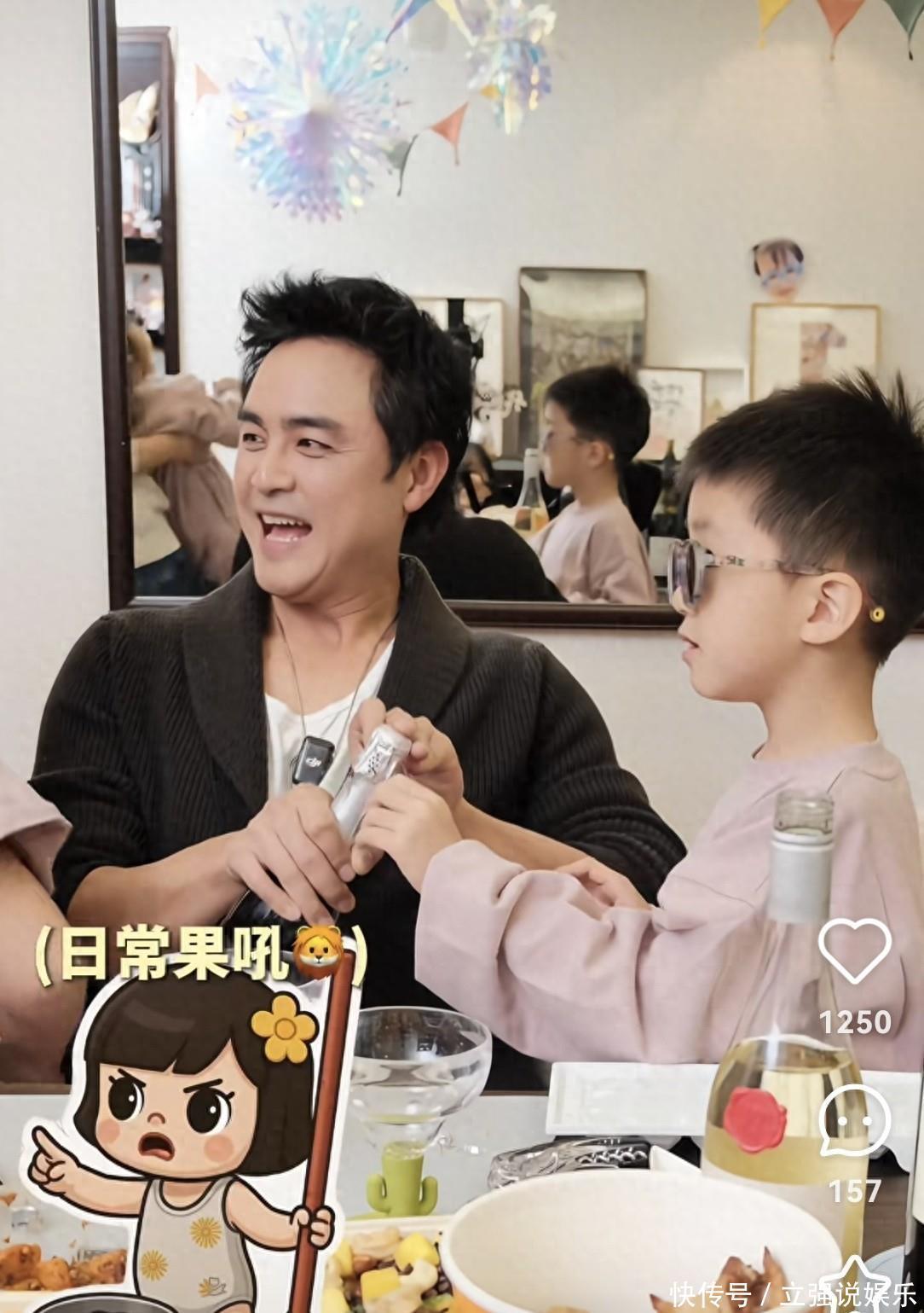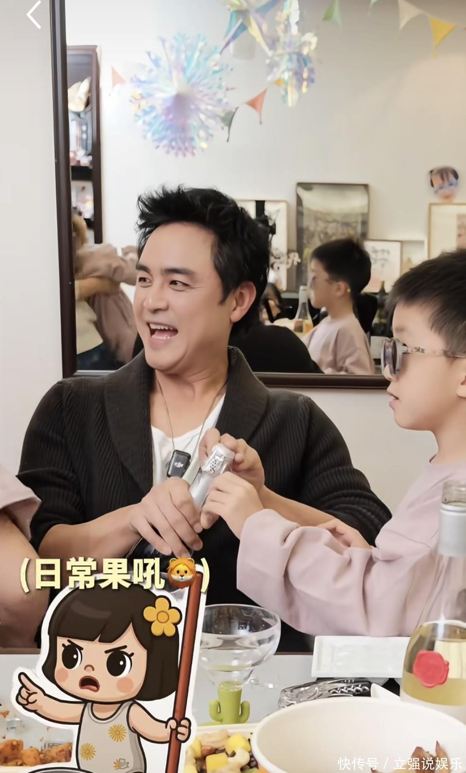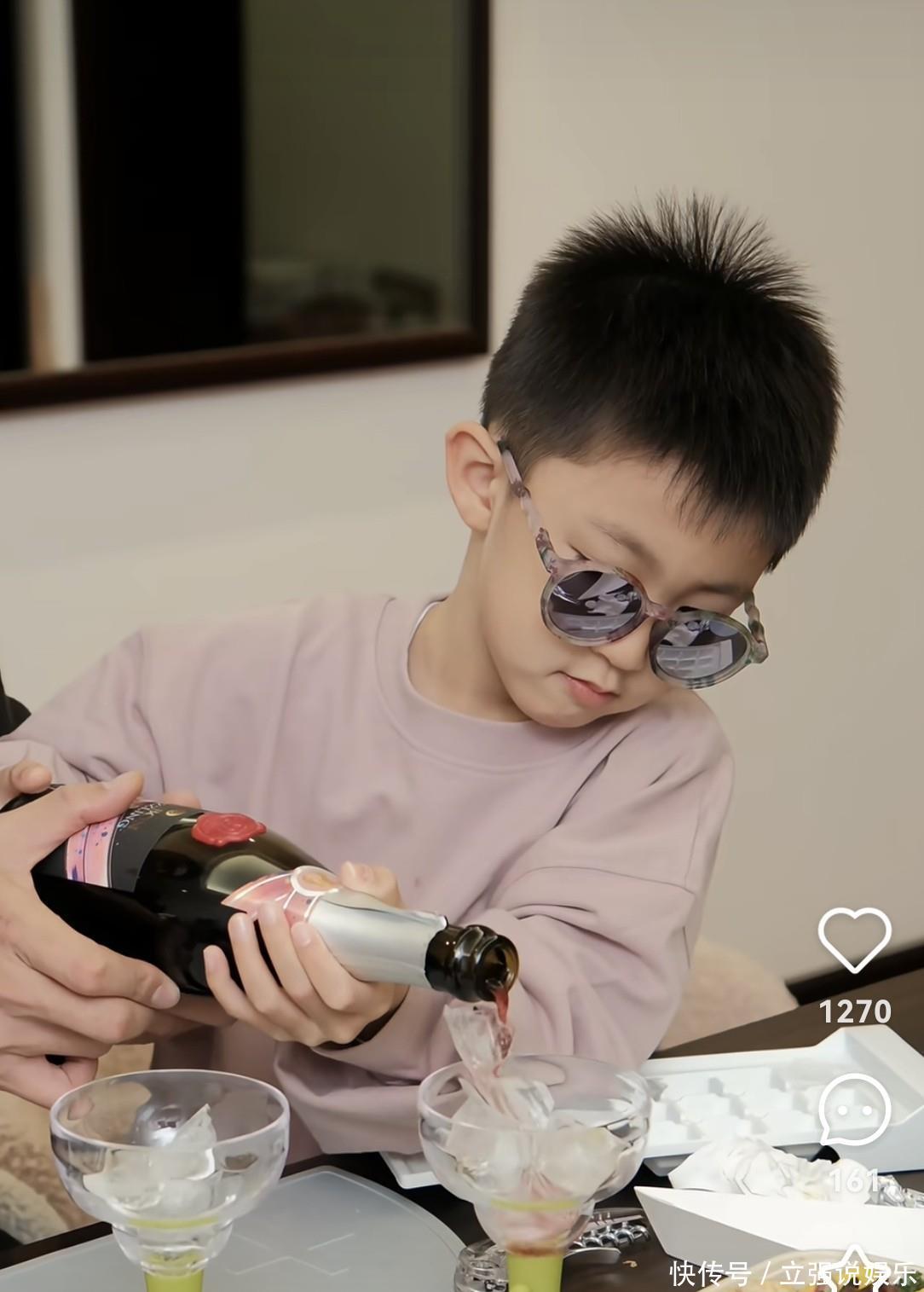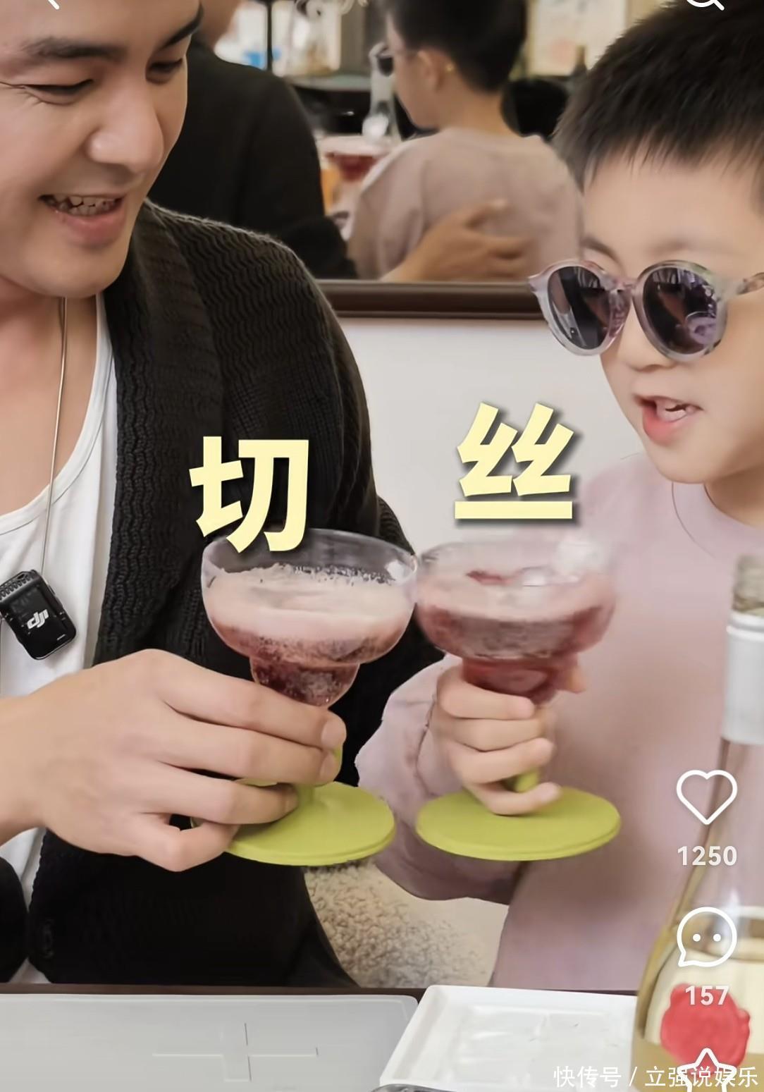 倒饮品时,明道扶着儿子的手一起倾斜瓶身,浅绿色底座的高脚杯里渐渐盛满紫红色的葡萄汁,儿子举着杯子和爸爸碰杯,嘴里还学着大人的样子说着“切丝”,活泼又可爱。
